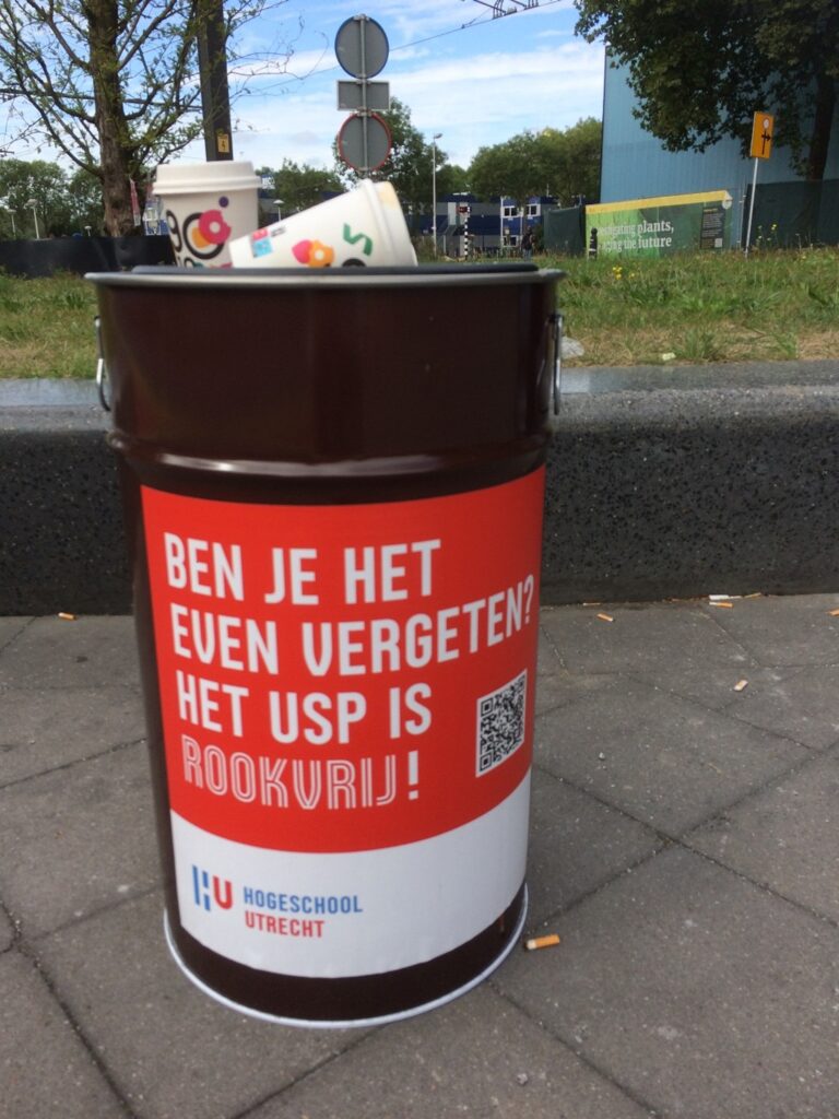 Naast de ingang van het HU-gebouw staat een student te roken. ‘Kijk zie je die blauwe tegel? Het USP is rookvrij tegenwoordig.’ De student drukt zijn peuk uit tegen de muur en laat hem demonstratief op de blauwe tegel vallen. ‘Ik bepaal zelf wel waar ik rook. Heb jij niks beters te doen dan rokers lastig vallen?’